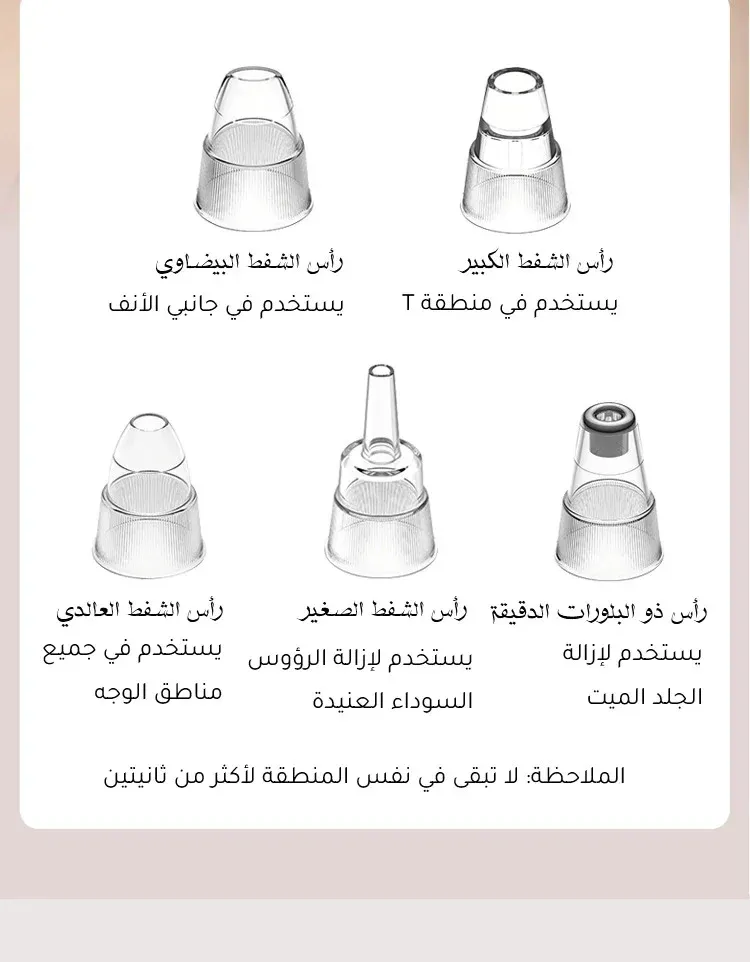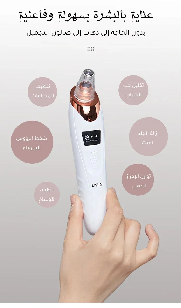 جهاز كهربائي محمول بخاصية الشفط القوي لتنظيف المسام.يأتي مع عدة رؤوس مختلفة لتناسب جميع مناطق الوجه.يساعد في إزالة الرؤوس السوداء والبيضاء، الأوساخ، وبقايا المكياج العميقة.